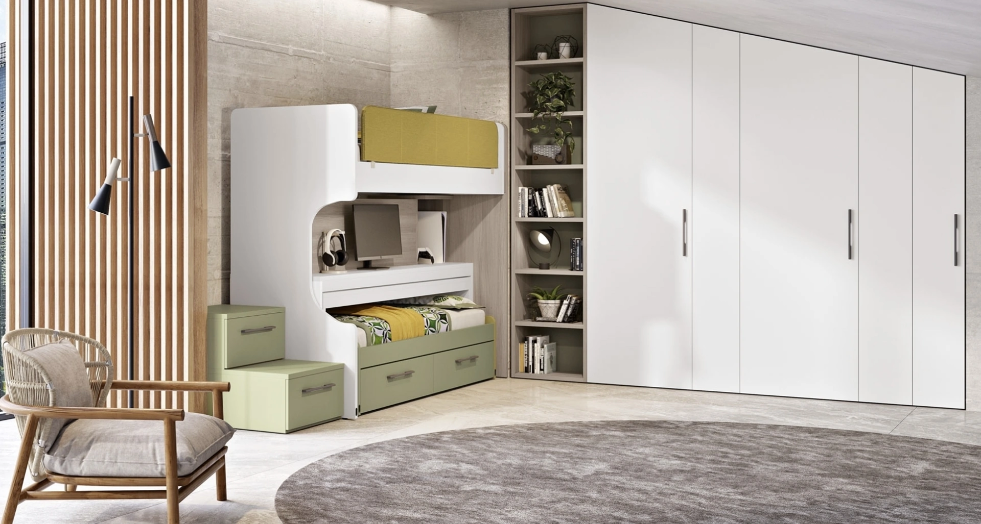 La Cameretta 137 di Ferrimobili in melaminico è un mondo complesso da decorare attentamente, coniugando molteplici elementi accessori su misura. Vieni nel nostro showroom e potrai vedere dal vivo tutte le più originali composizioni d'arredo con letti scorrevoli moderne di Ferrimobili per i più giovani. Cromie di tendenza e progetti articolati ad hoc contraddistinguono le più originali composizioni del rinomato brand che proponiamo nel nostro showroom. Con una composizione arredativa Ferrimobili, potrai completare con funzionalità e design l'ambiente in cui i tuoi figli passano gli anni fondamentali della vita.