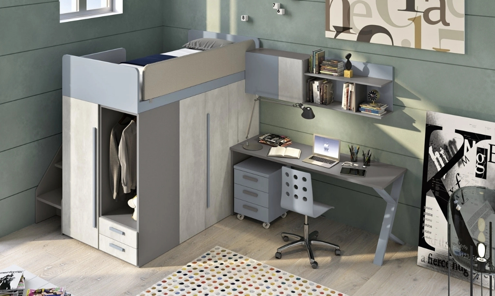 Nel nostro showroom ci occupiamo di seguirti dalla scelta dei mobili per la camera alla progettazione del luogo dove i tuoi bimbi cresceranno, divertendosi e sognando. I nostri bambini trascorrono molto tempo della giornata nelle loro camere da letto: rendile adatte per dedicarsi alla scuola, giocare e dormire quotidianamente. Con la Cameretta 140 a soppalco di Ferrimobili in melaminico ti assicurerai un perfetto accordo di funzionalità ed ergonomia, ideale per la stanza dei tuoi bambini. Presentiamo nel nostro punto vendita svariate Camerette a soppalco design per ragazzi del brand, ideali per seguirli durante il loro sviluppo.