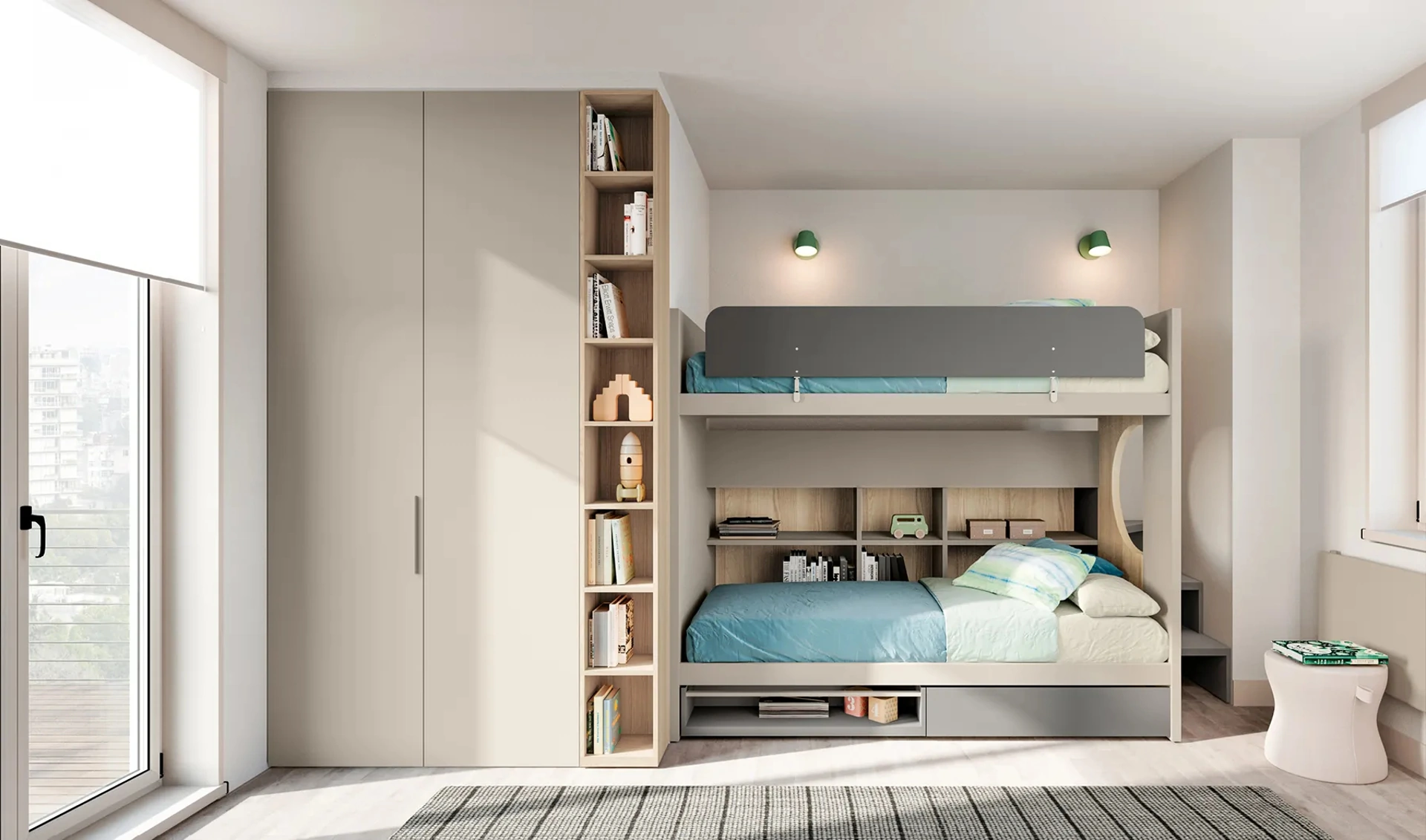 Doimo Cityline dispone di una ricca gamma di accessori da comporre su misura: troverai letto, armadio o cabina armadio, scrivania, sedie e librerie. Questa proposta in laccato opaco ultima al meglio le doti di praticità e il valore estetico della camaretta, in quanto è capace di coniugare ergonomia e sicurezza. Se cerchi spunti creativi per arredare al meglio la stanza dei tuoi figli, ti proponiamo la Cameretta Layout 11B di Doimo Cityline con finitura in laccato opaco. Porta contenuto estetico e colori vivaci nella stanza dedicata ai più giovani con questa proposta, una tra le Camerette con letti a castello per bambini di Doimo Cityline.