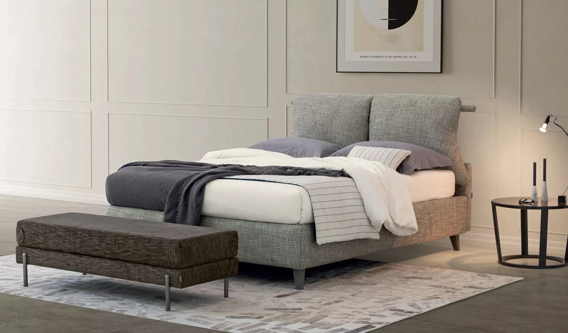 Per completare perfettamente l'arredo della tua zona notte è essenziale valutare gli accostamenti del letto con armadi e comodini, accessori e quant'altro: se desideri arredi moderni, il modello nella fotografia fa al caso tuo. Questa è una soluzione di grande fascino, che rappresenta tutta l'eccellenza garantita dalla pluriennale esperienza del marchio nel campo. Il Letto in tessuto Pug di Oggioni è uno tra i prodotti più originali della marca, garanzia di resistenza nel tempo, qualità delle finiture e uno stile unico.
